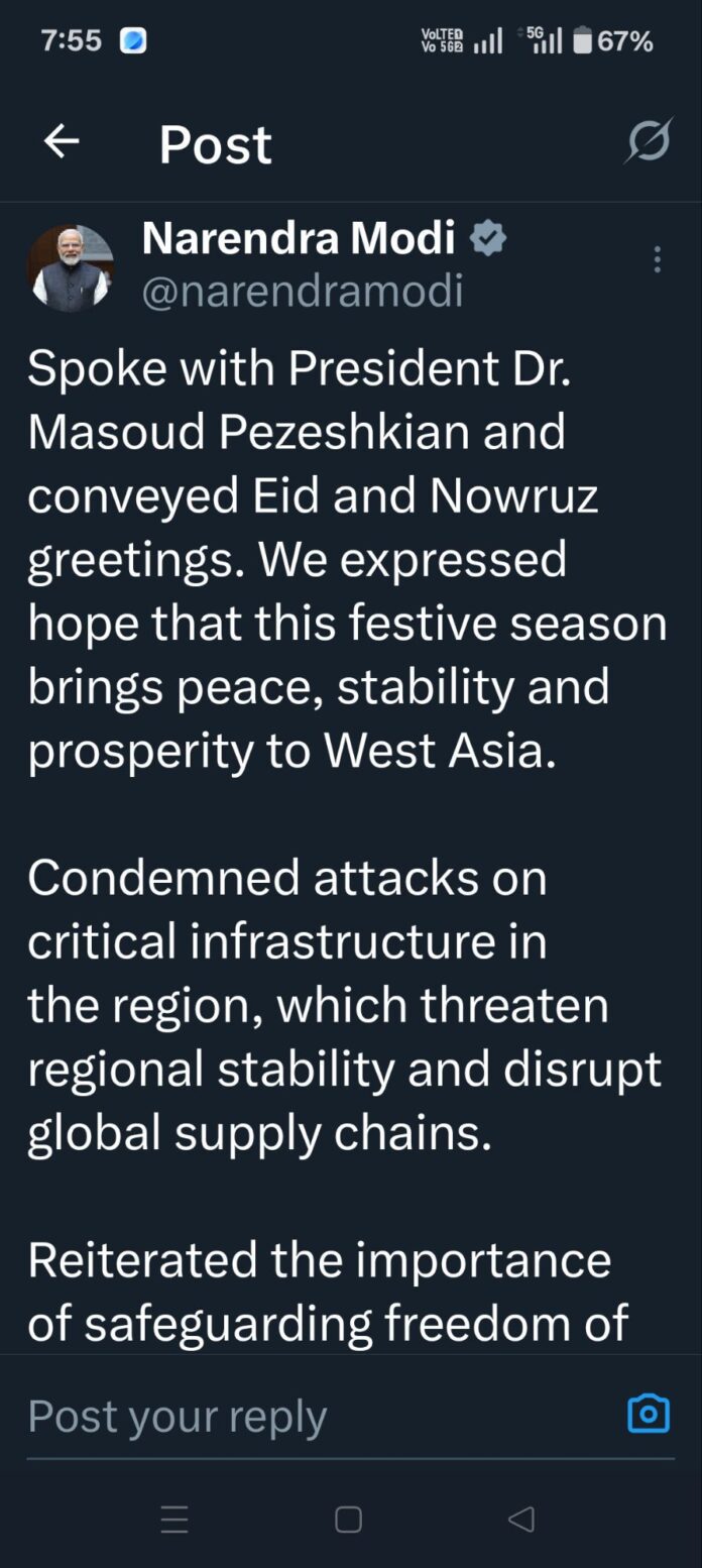 “राष्ट्रपति डॉ. मसूद पेज़ेश्कियन से बात की और ईद तथा नवरोज़ की शुभकामनाएँ दीं। हमने उम्मीद ज़ाहिर की कि यह त्योहारी मौसम पश्चिम एशिया में शांति, स्थिरता और समृद्धि लाएगा।