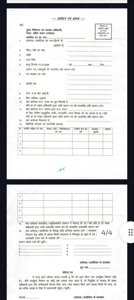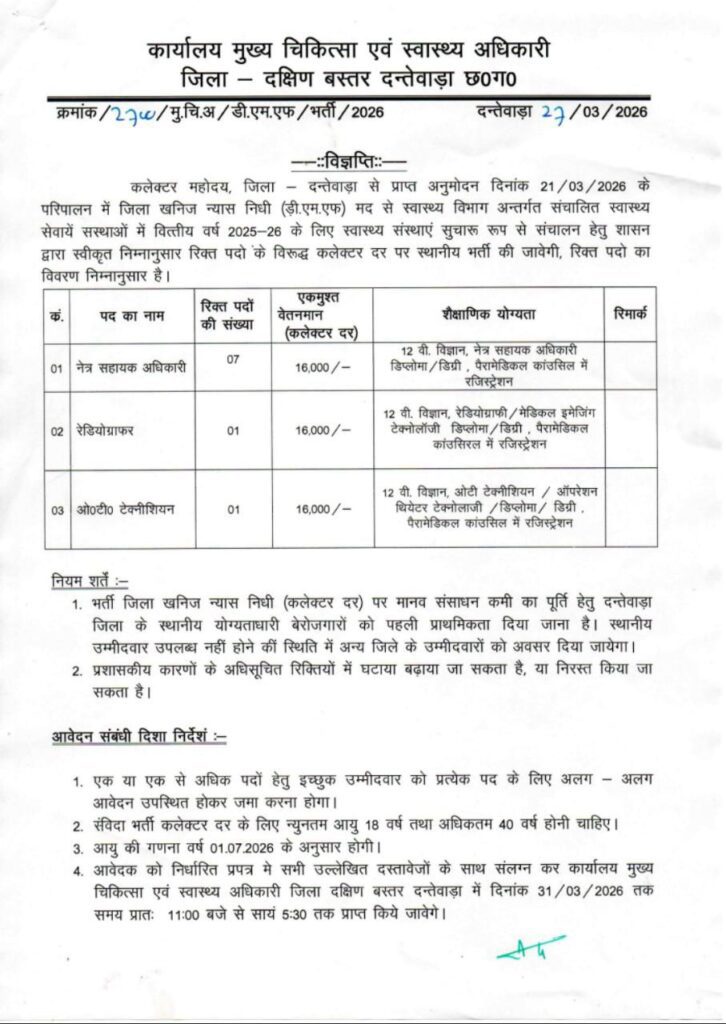 जिले के युवाओं के लिए बड़ी खबर सामने आई है। दंतेवाड़ा स्वास्थ्य विभाग द्वारा राष्ट्रीय स्वास्थ्य मिशन (NHM) के अंतर्गत विभिन्न पदों पर संविदा भर्ती के लिए आवेदन आमंत्रित किए गए हैं।