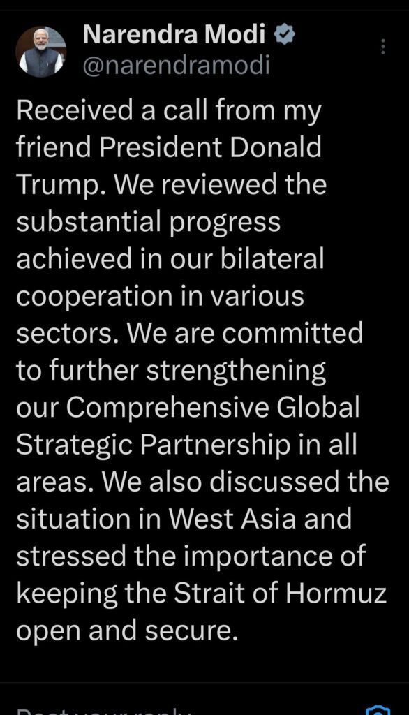 फोन वार्ता के दौरान दोनों नेताओं ने विभिन्न क्षेत्रों में द्विपक्षीय सहयोग की अब तक की प्रगति की समीक्षा की। साथ ही, भारत और अमेरिका के बीच व्यापक वैश्विक रणनीतिक साझेदारी को और अधिक मजबूत बनाने की प्रतिबद्धता दोहराई।