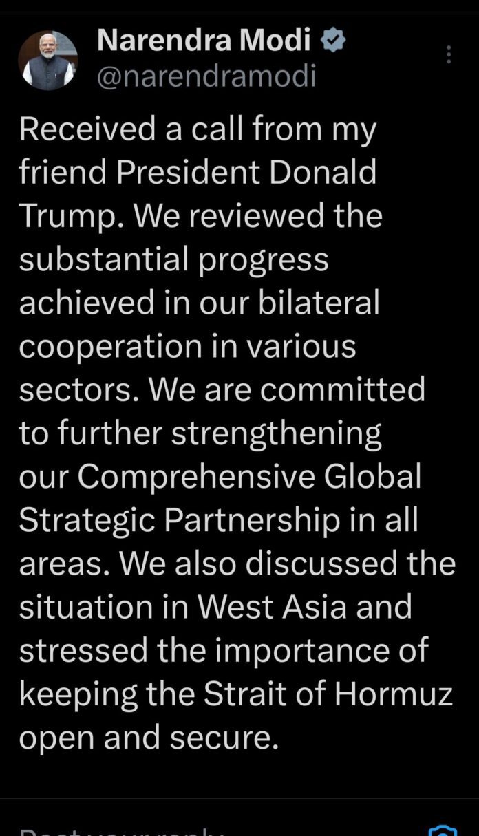 बातचीत में पश्चिम एशिया की मौजूदा स्थिति पर भी विस्तार से चर्चा हुई। दोनों नेताओं ने विशेष रूप से होर्मुज़ जलडमरूमध्य को खुला और सुरक्षित बनाए रखने के महत्व पर जोर दिया, जो वैश्विक ऊर्जा आपूर्ति के लिए अत्यंत महत्वपूर्ण मार्ग माना जाता है।